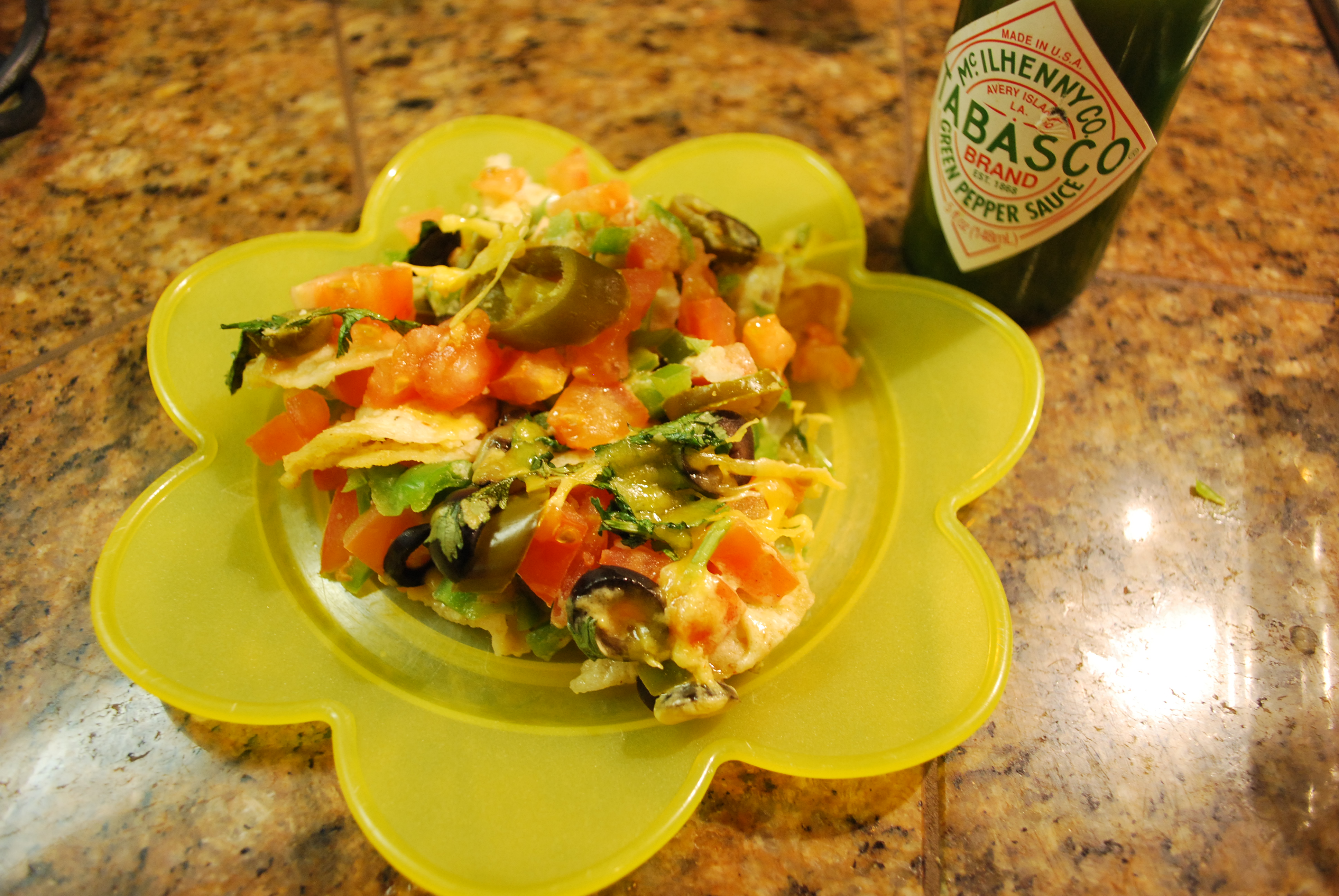 Craving the ooey-gooey warmth of those movie theater nachos? Well, give it a savory twist with half the calories! This recipe makes a savory afternoon snack, or party appetizer.