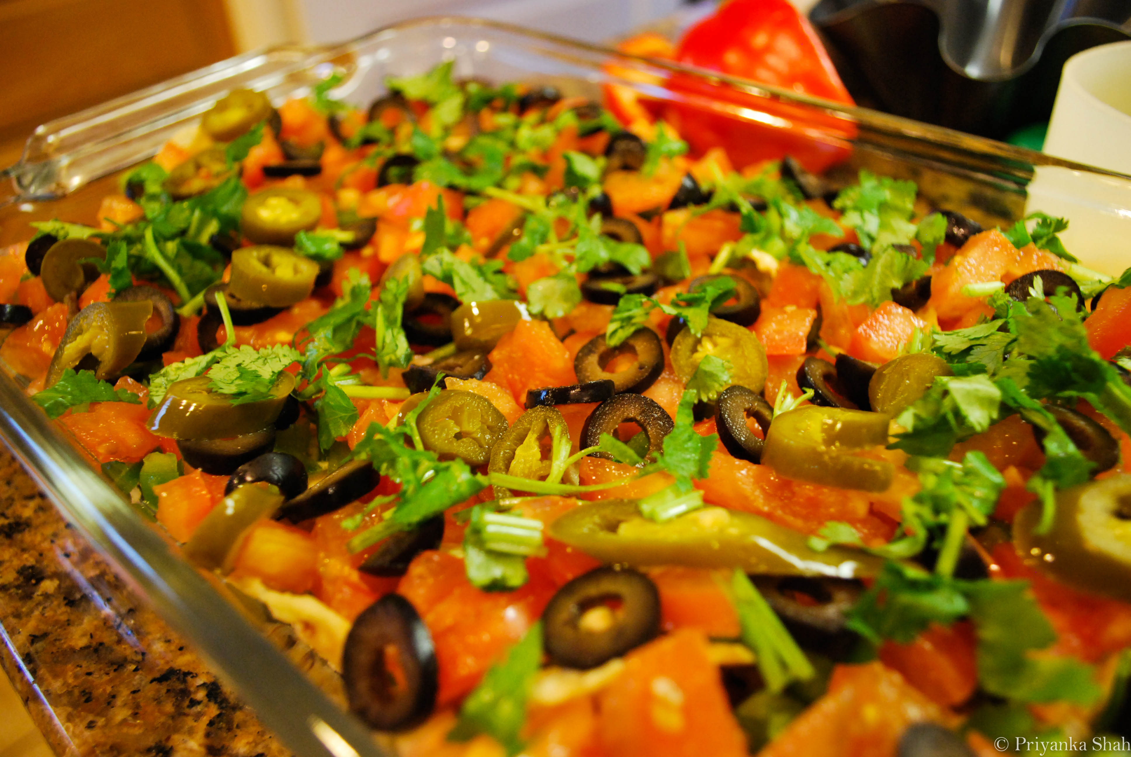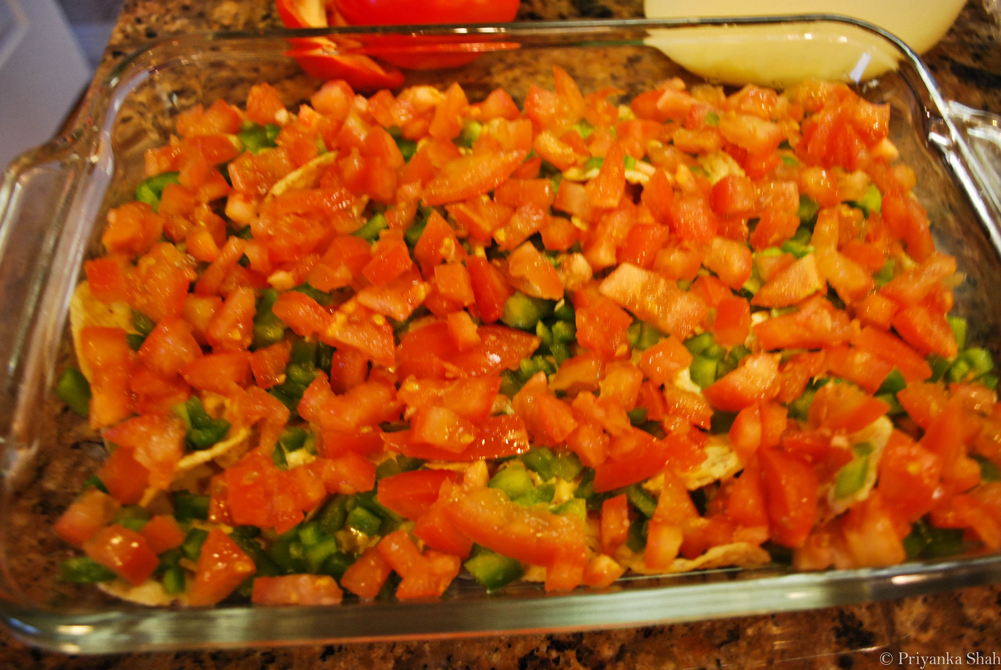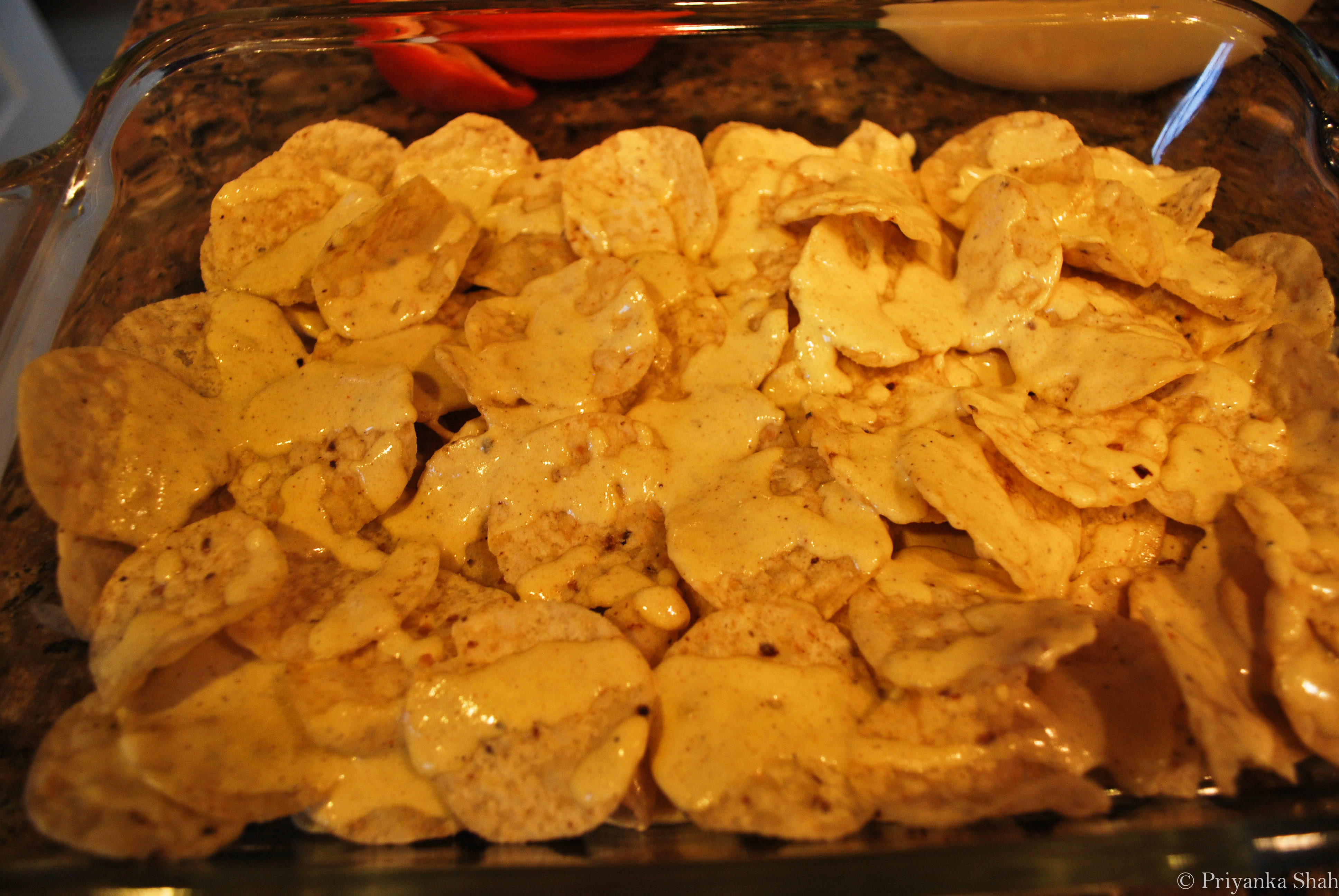Spread the tortilla chips in a large glass pan. Preheat your oven to 400ºF. Drizzle the masala cream sauce generously over the chips. Layer veggies as follows!