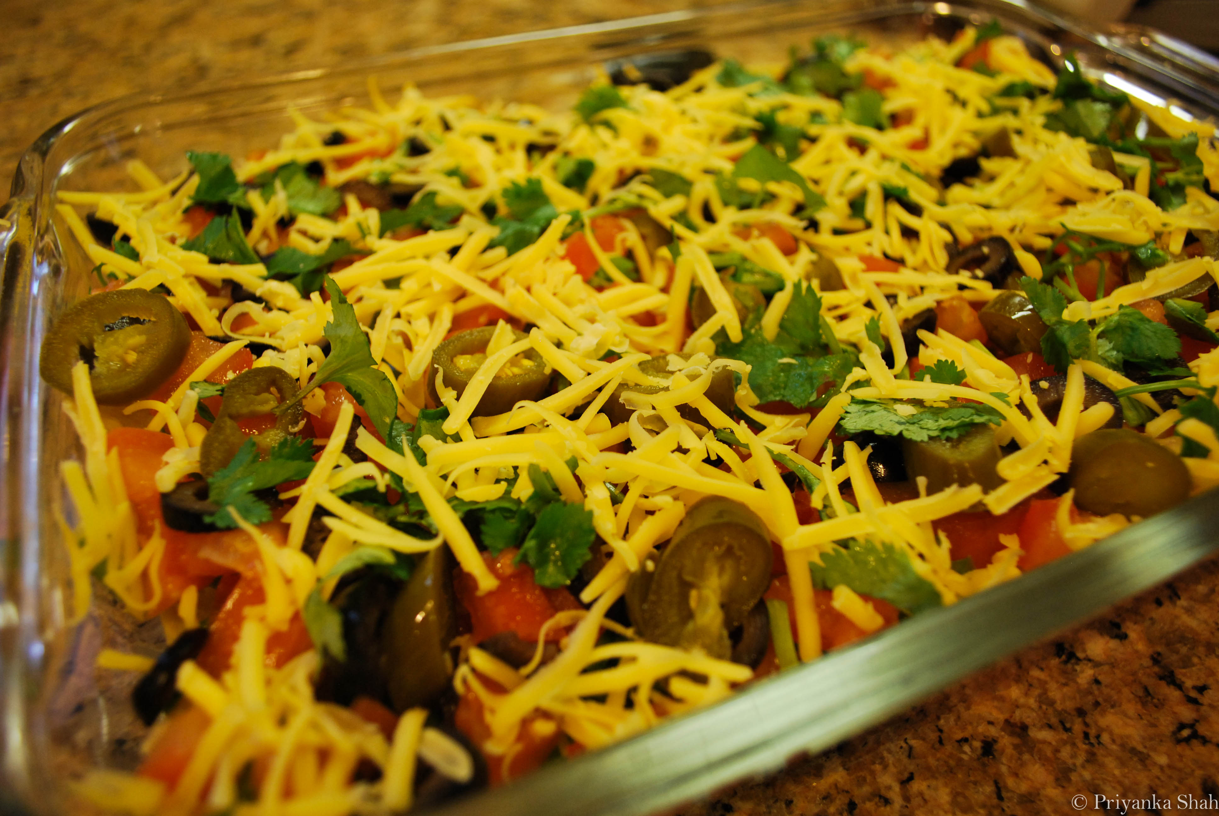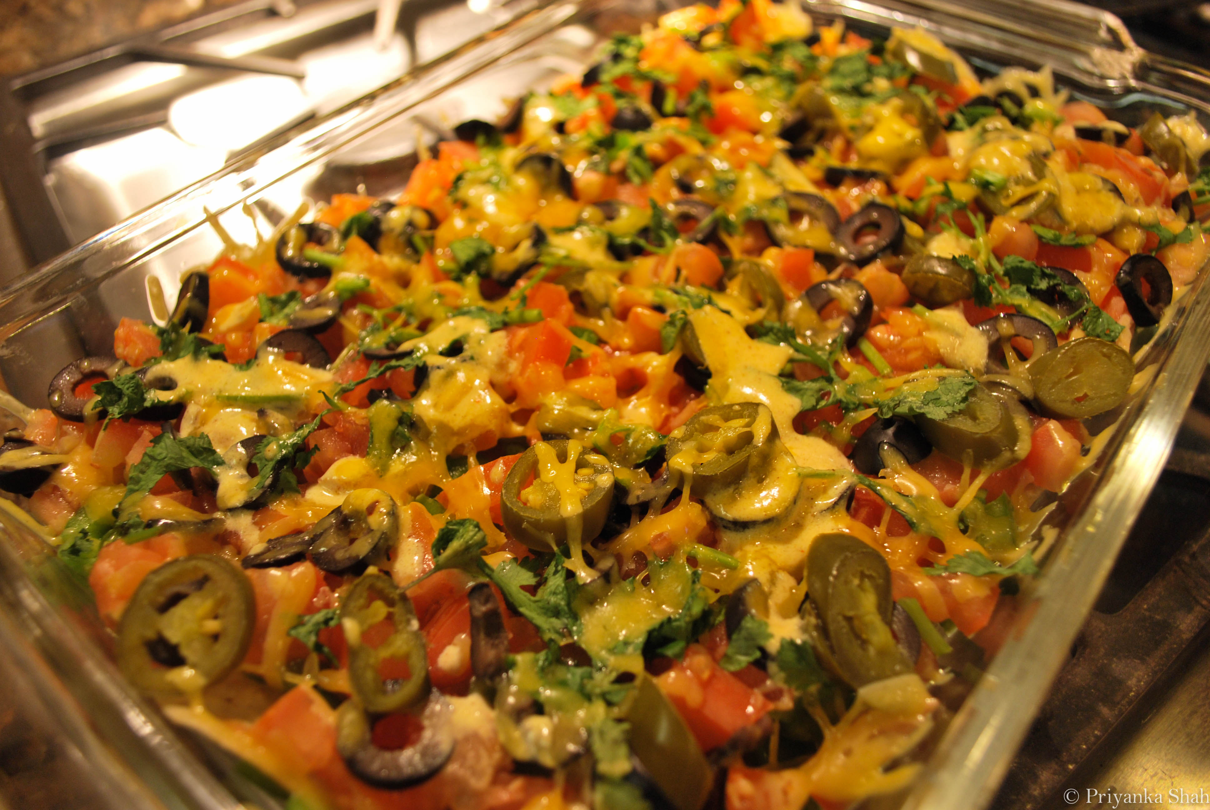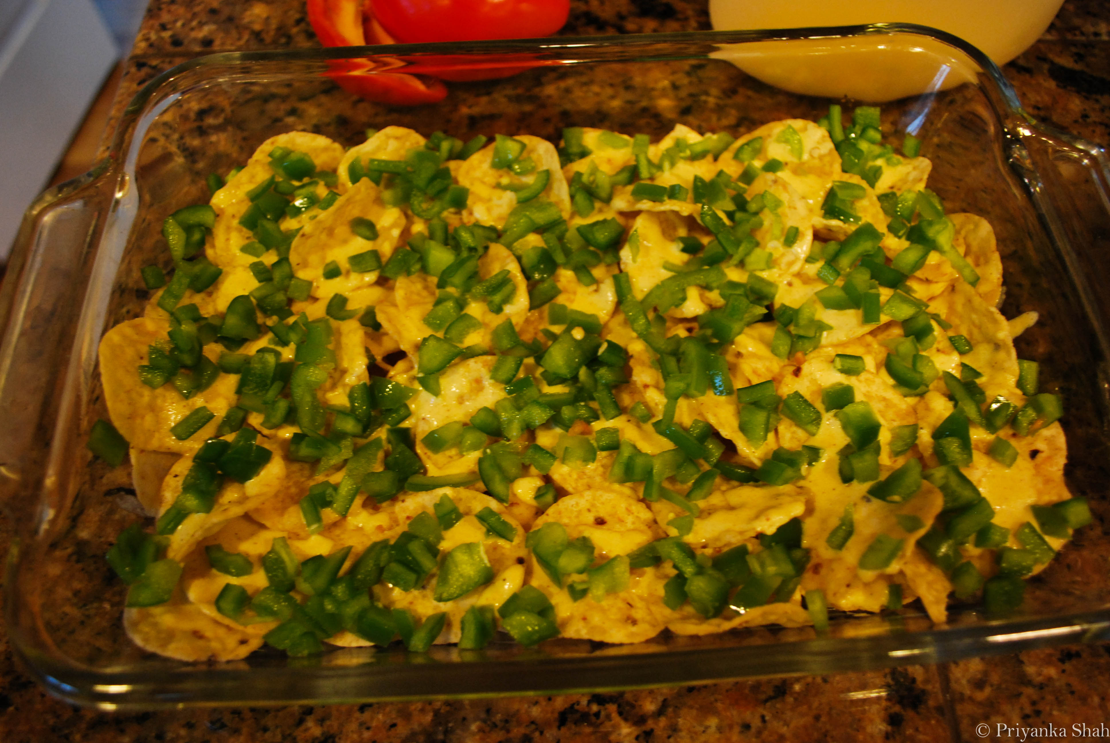 Spread the tortilla chips in a large glass pan. Preheat your oven to 400ºF. Drizzle the masala cream sauce generously over the chips. Layer veggies as follows!