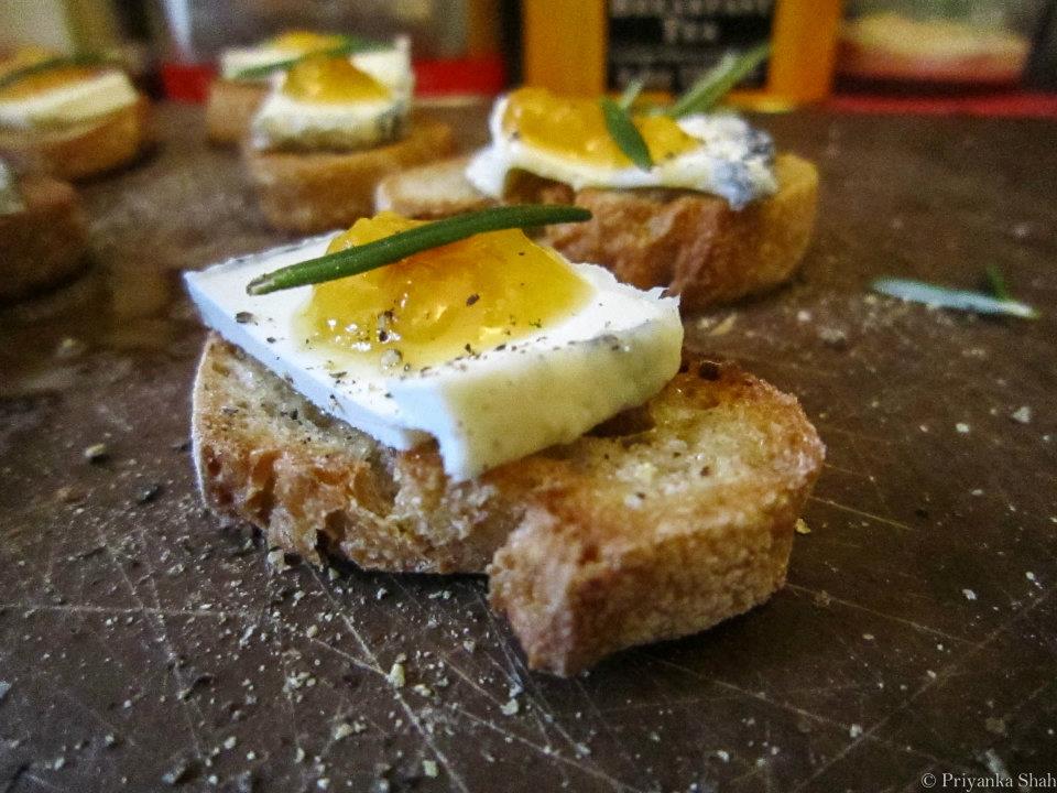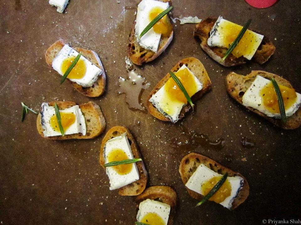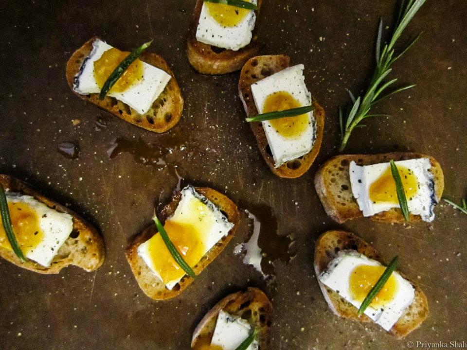 Assemble the crostini. Place the goat cheese over the bread, and dollop on some clementine jam/preserves. Top off with a rosemary leaf.