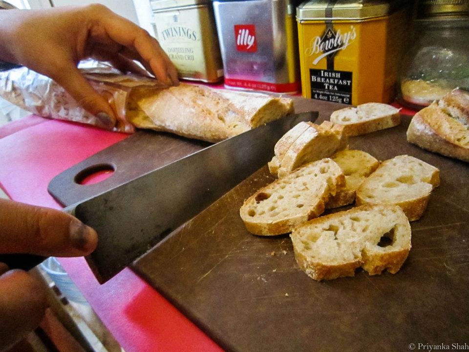 Meanwhile, slice the french bread loaf in about 1/4 inch thick slices.