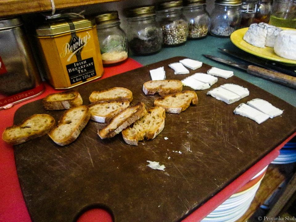 Slice the goat cheese into rectangular pieces about the size of your bread. Brush olive oil over the bread slices, and slightly toast them in the oven for about 5-7 minutes until they are browned around the edges.