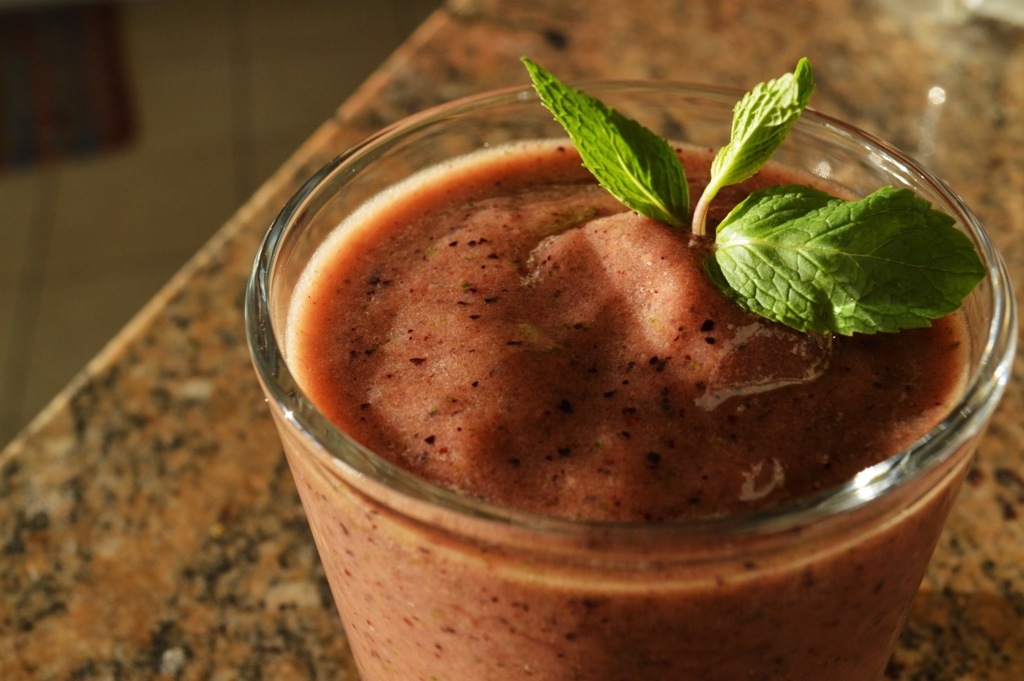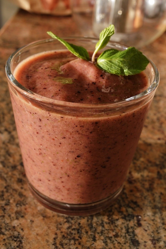 1 cup natural coconut water 1/2 cup frozen blueberries 1/2 ripe banana 1/2 cup frozen mango chunks 1 cup baby spinach 2 fresh/frozen slices of pineapple 1 tbs chia seeds wedge of lime mint to garnish ice