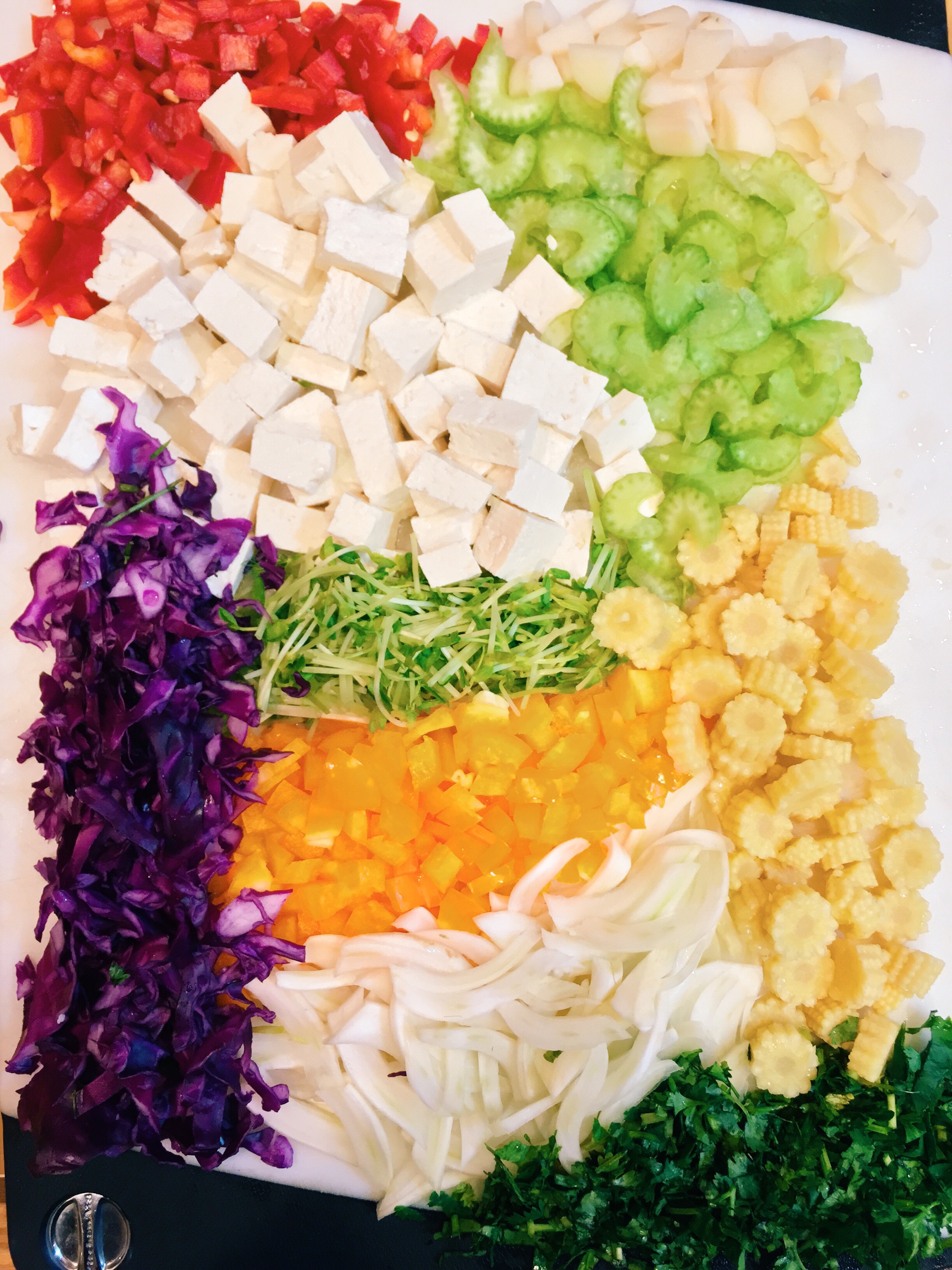 Add initial batch of tougher veggies back into the mixture for final seasoning. Squeeze in lemon juice. Drizzle soy sauce and sambal oelek chili paste to evenly coat and toss the mixture. Don’t forget to add a twist or two of freshly ground sea salt and black pepper. Sprinkle cilantro over the filling and transfer to a glass bowl.