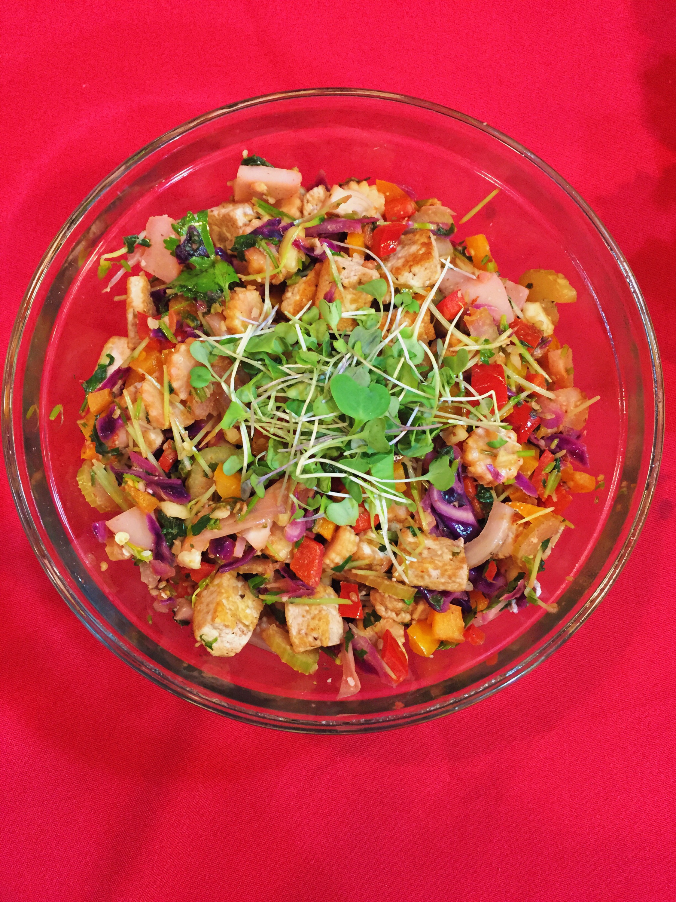 Next, heat 1 tablespoon coconut oil, a drizzle of sesame oil, and a spoon of rice vinegar in the pan. Then, pan-fry the tofu until golden brown and crispy on the edges. Add in purple cabbage, bell pepper, and bean/pea sprouts; cook for 2-3 minutes.