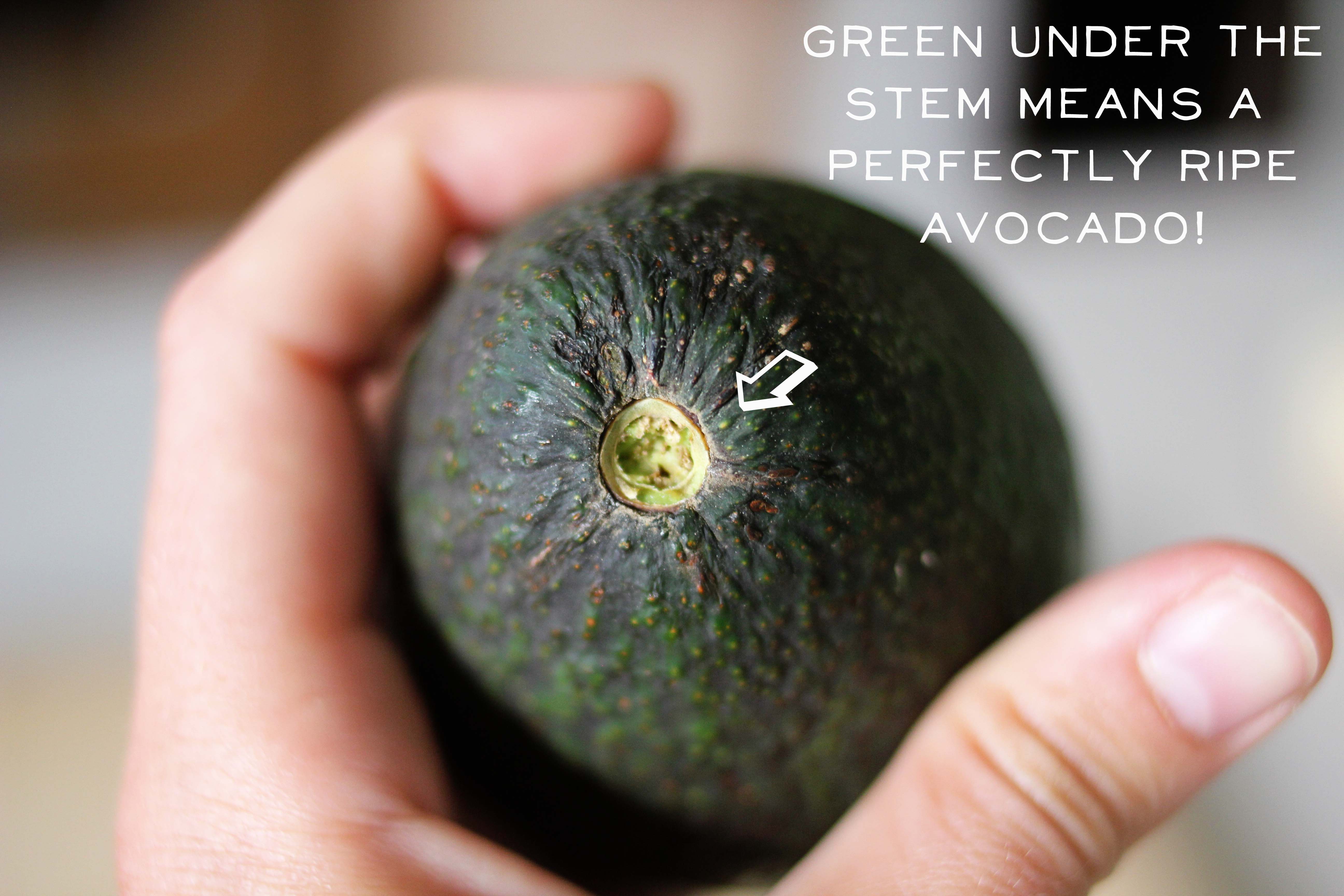 A quick trick to know if your avocados are ripe: Gently peel off the stem and look for a bright green color like below. Then your avocado is ready to go!