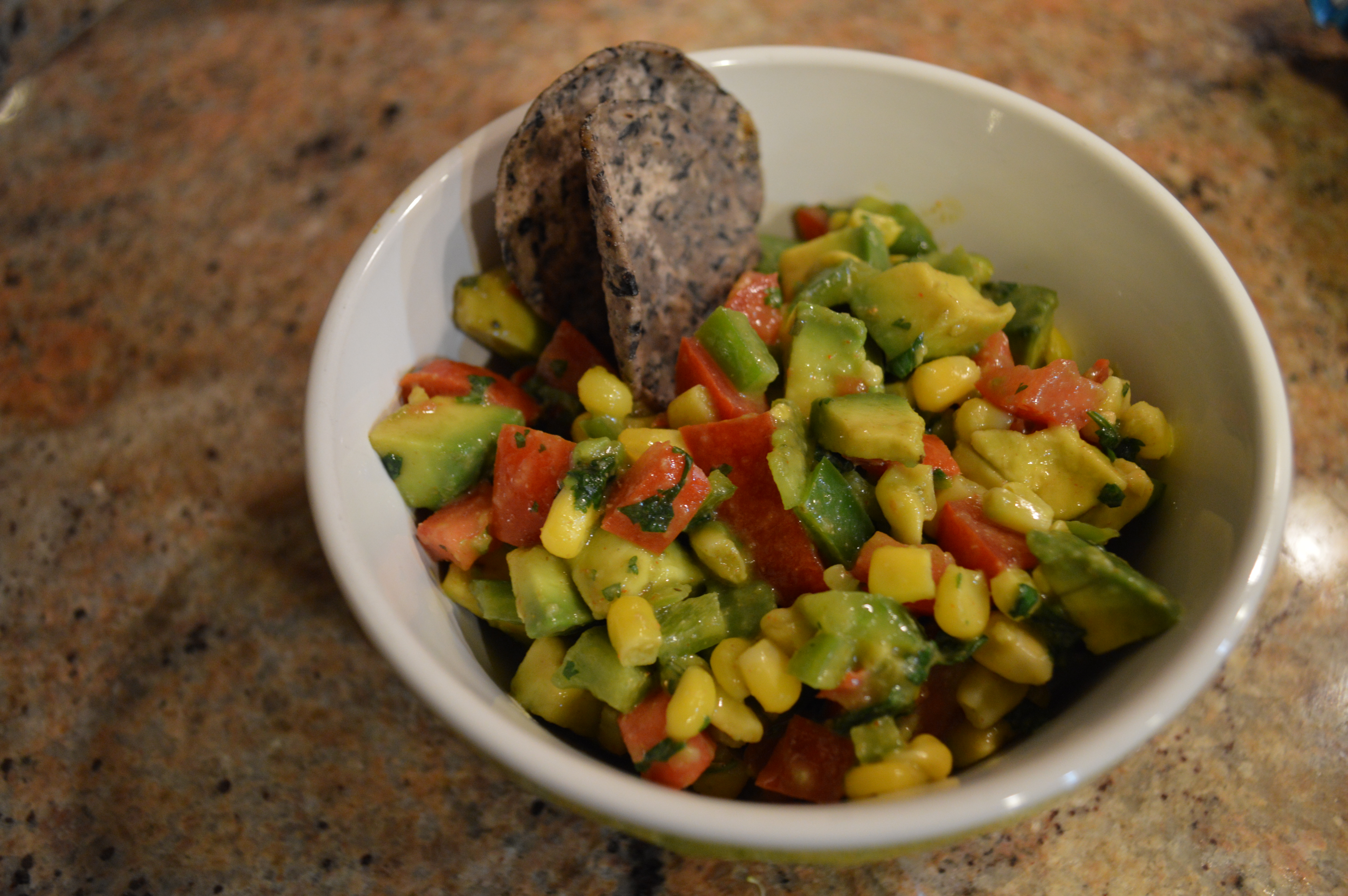Simply toss all prepped ingredients into a bowl and mix! Add lemon juice, spices, and salt as you mix to your taste preference. Pair with some healthy chips–here I used some black bean chips I bought at Costco. Feel free to use this mix in tacos, quesadillas, or on tostadas too.