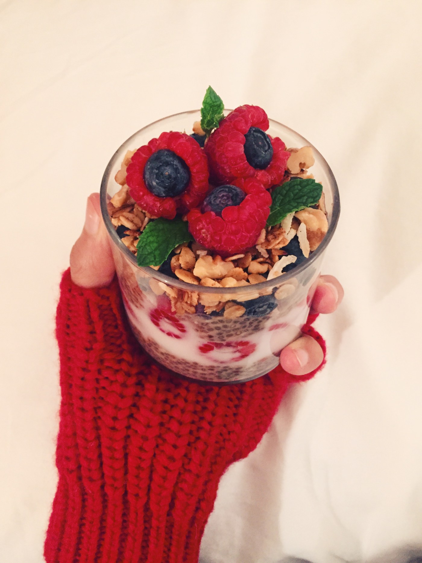 Assemble alternating chia seed and parfait layers as desired. Top with granola and garnish with mint leaves and berries. To give it a Christmas holiday look, I created a ‘mistletoe’ topping by stuffing blueberries into raspberries and adding mint leaves.