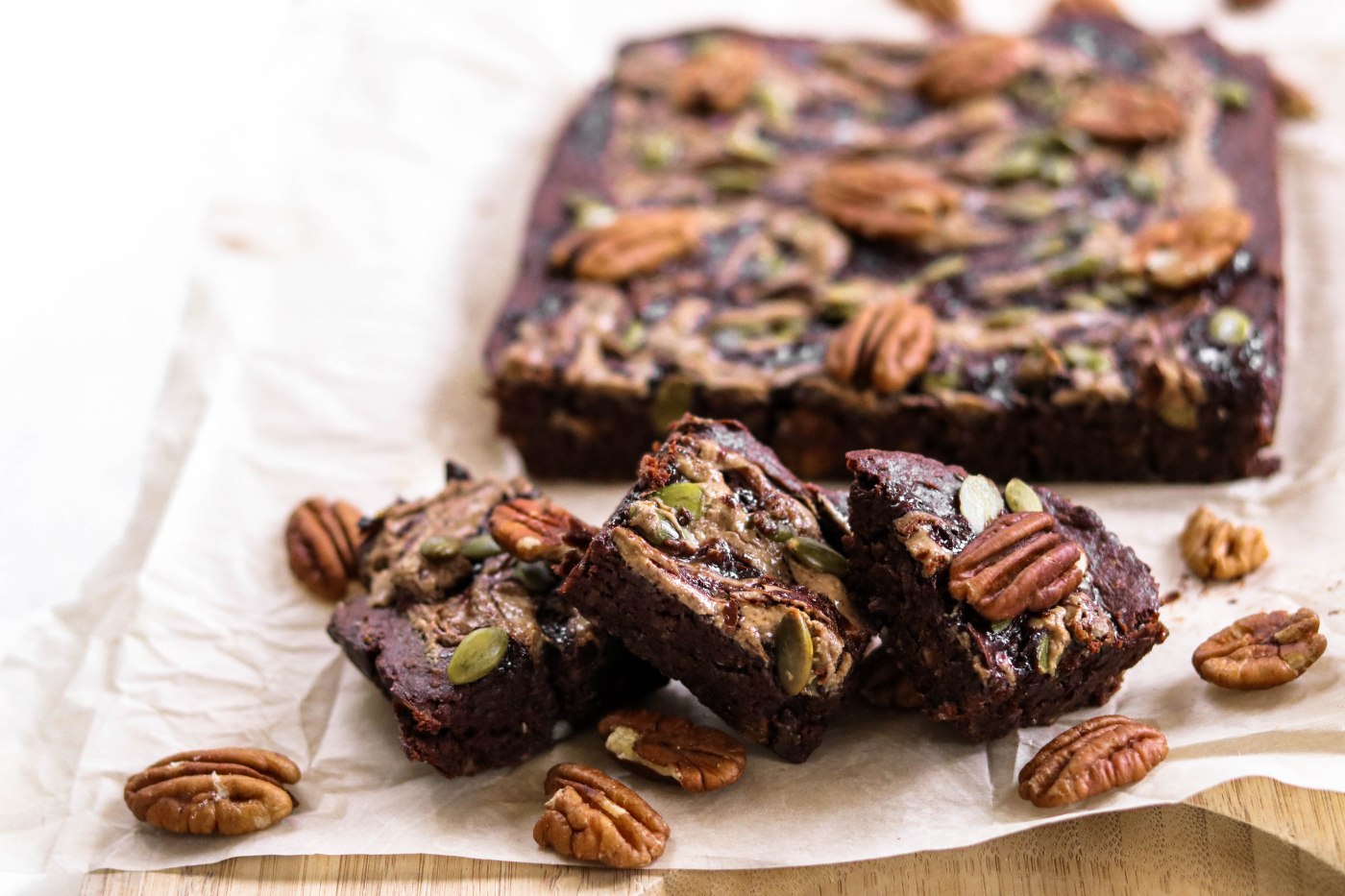 - Optional: Add your favorite toppings… I topped my brownies off with some melted dark chocolate chips swirled with almond butter, sprinkled on some pumpkin seeds, and pecans. Feel free to use whatever toppings you have on hand–chia seeds, nut butter, pumpkin seeds, hemp seeds, coconut flakes…to name a few ideas!