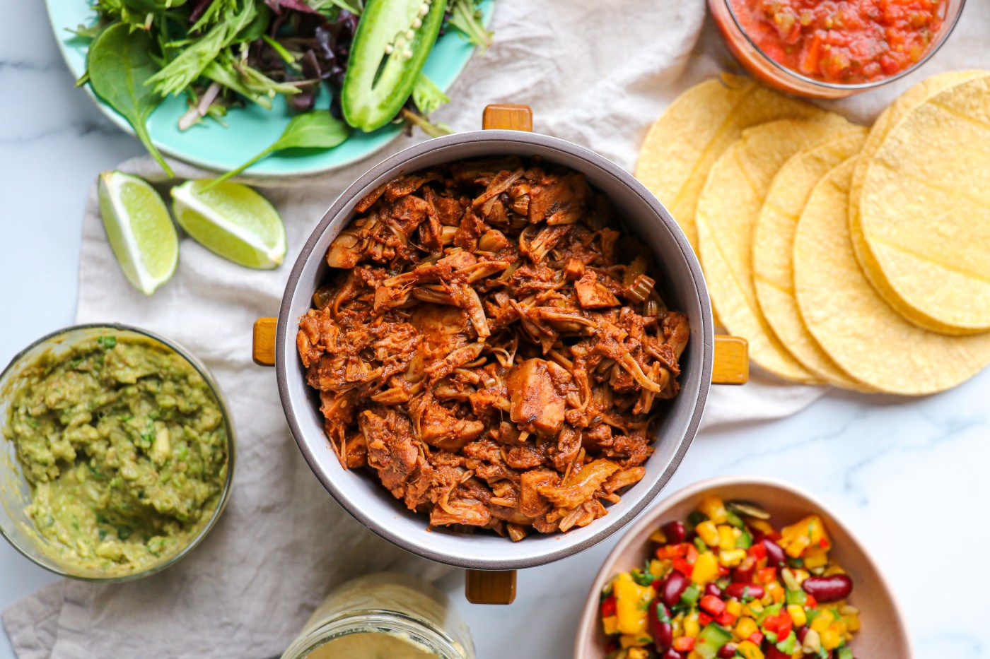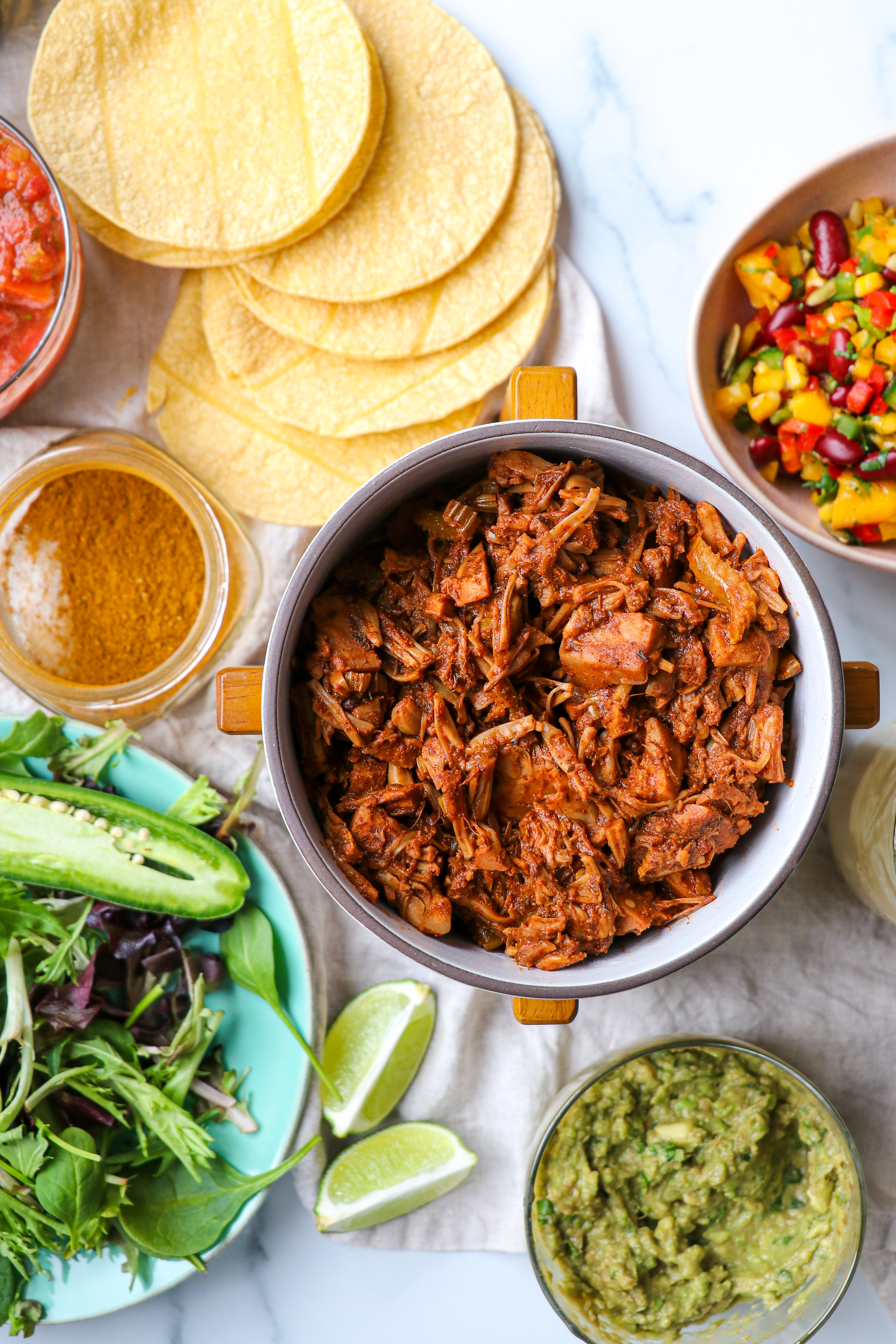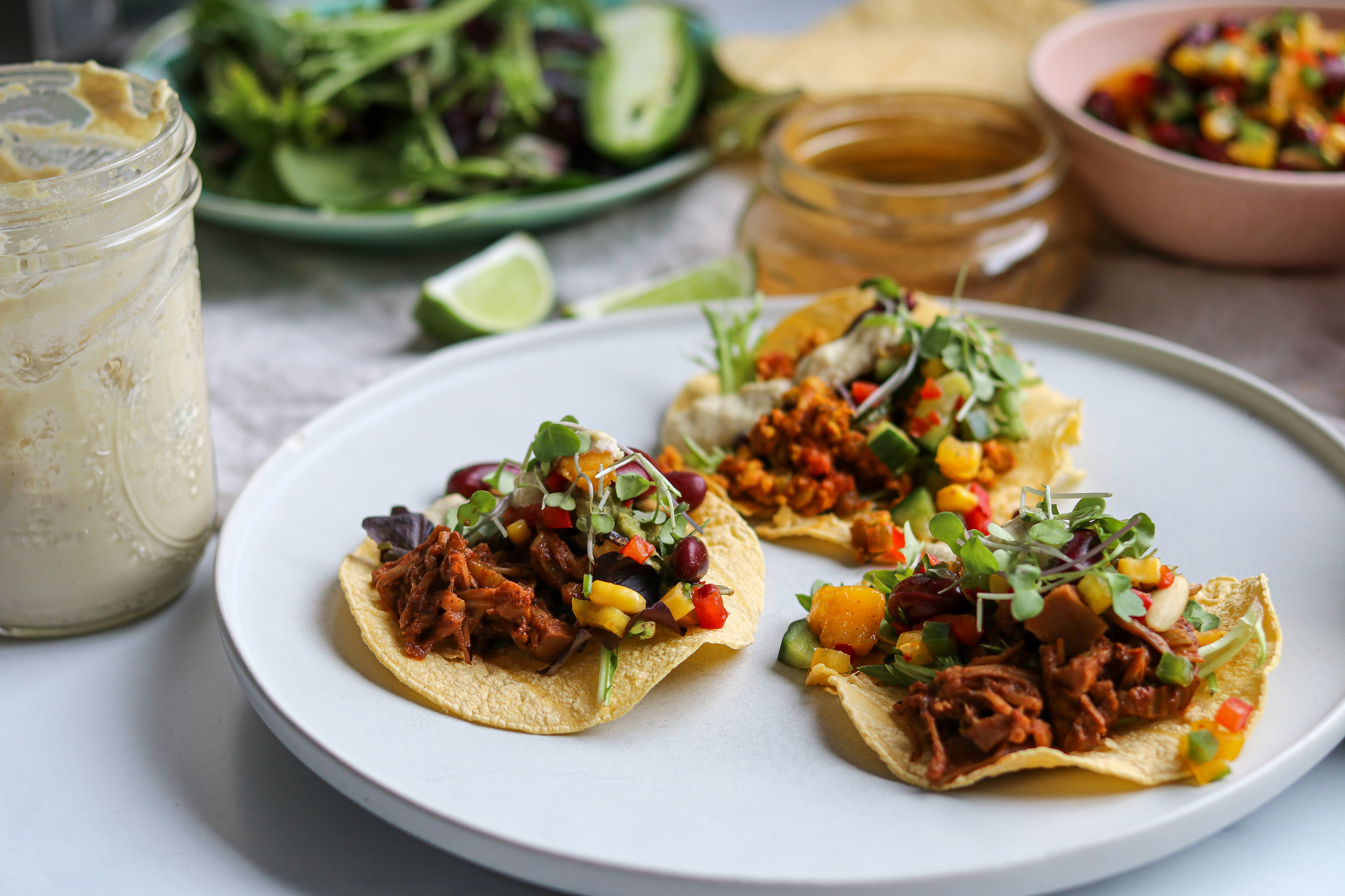 To serve, I assembled these delicious tacos with a mango-pepper-bean salad (recipe coming soon!), a tangy lime cashew sour cream (recipe coming soon!), fresh salsa, guacamole, and some vibrant greens.