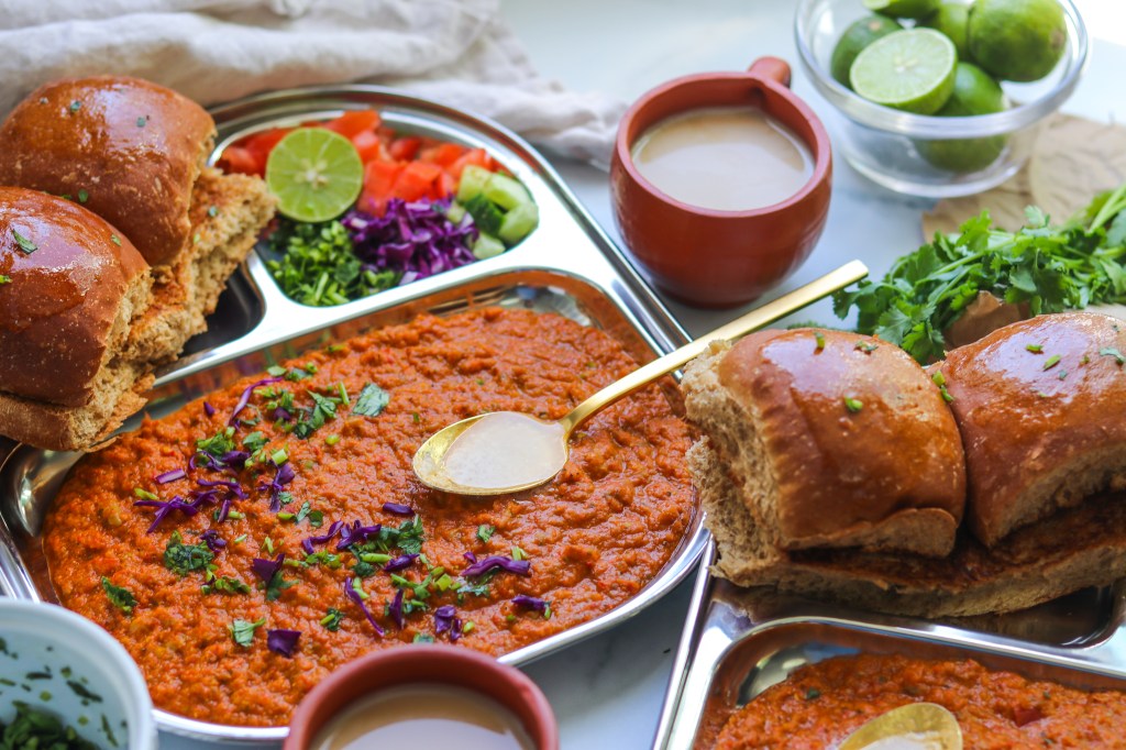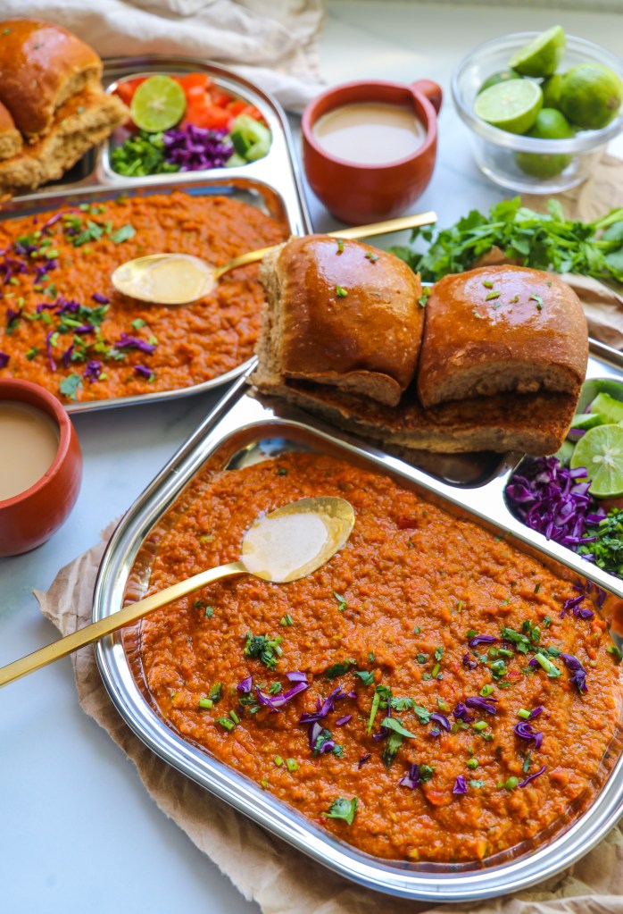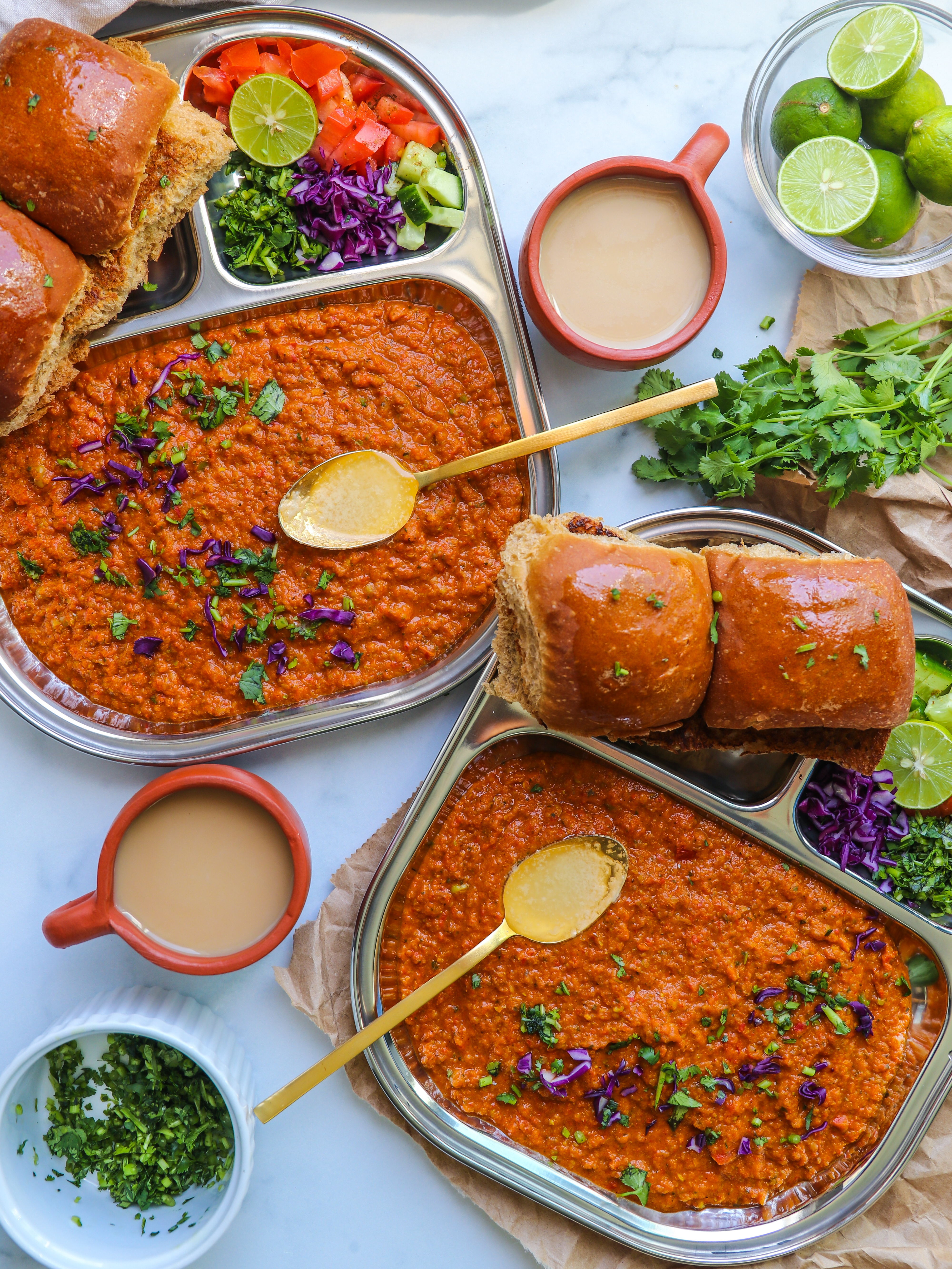 Pav Bhaji is a flavorful mélange of mashed veggies simmered in fragrant spices to create a bold bhaji (curry), that is scooped up with lightly toasted fluffy pav (bread rolls) smothered in butter. Needless to say, it is one of the most iconic street foods from Mumbai. While it is totally okay to indulge in the street version of Pav Bhaji once in a while, it is so easy to make a healthier version at home that is both vegan and Jain.