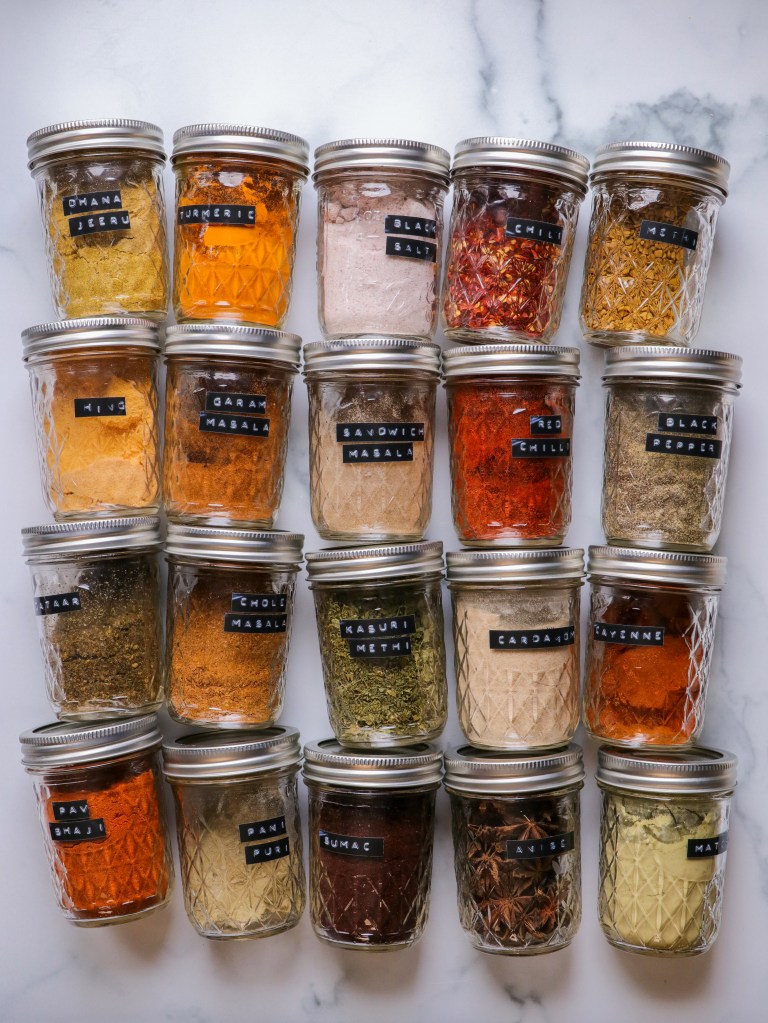 • Spices: dried curry leaves, dried chilis, a variety of Indian spices, Italian spices, dried ginger, zaatar, salt, pepper