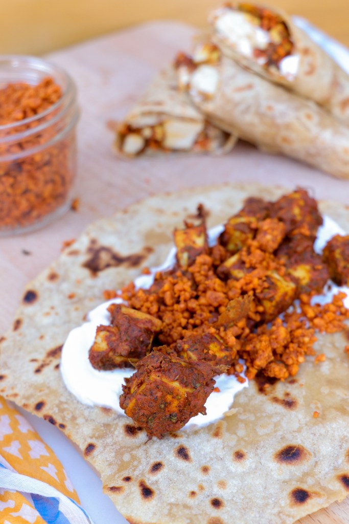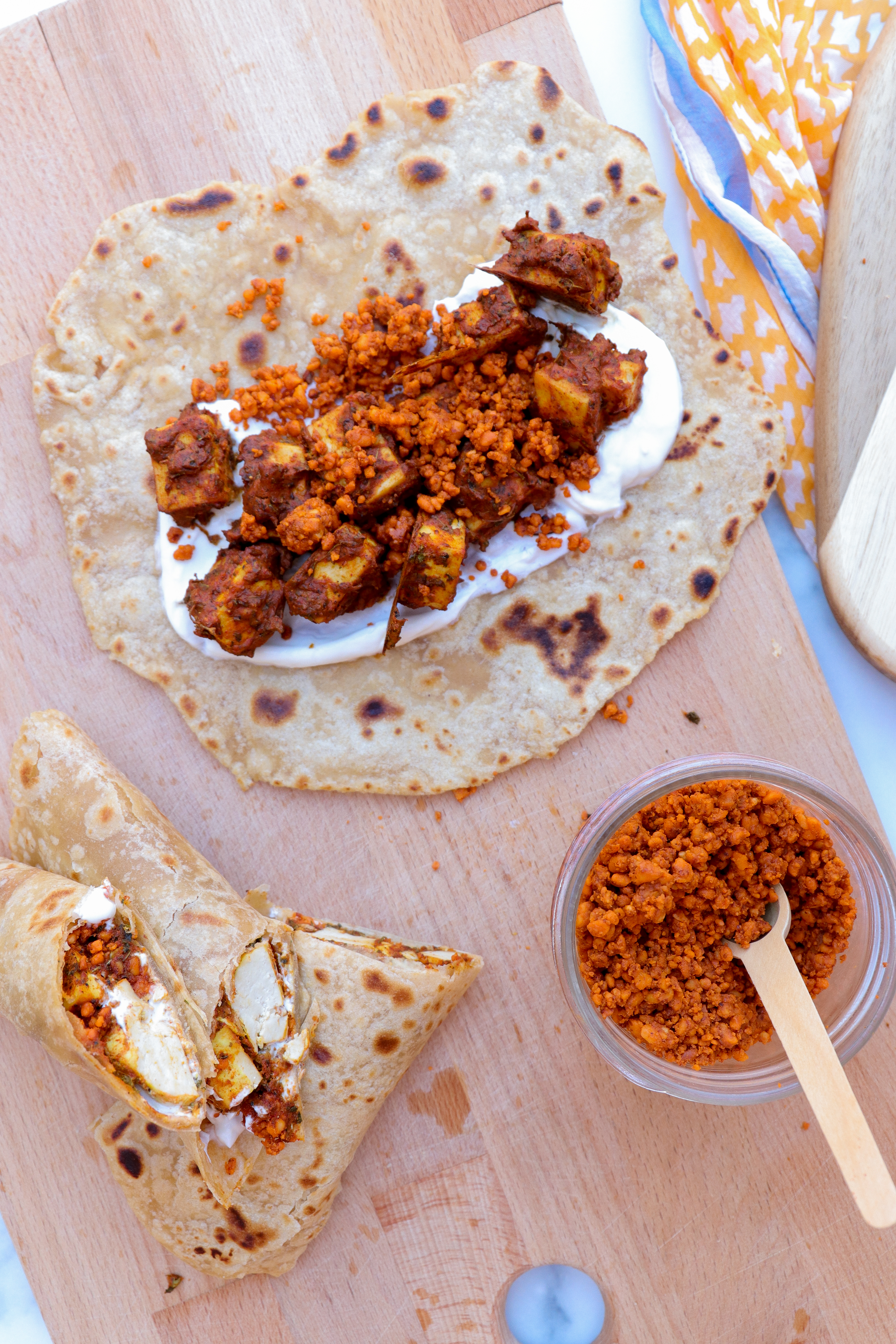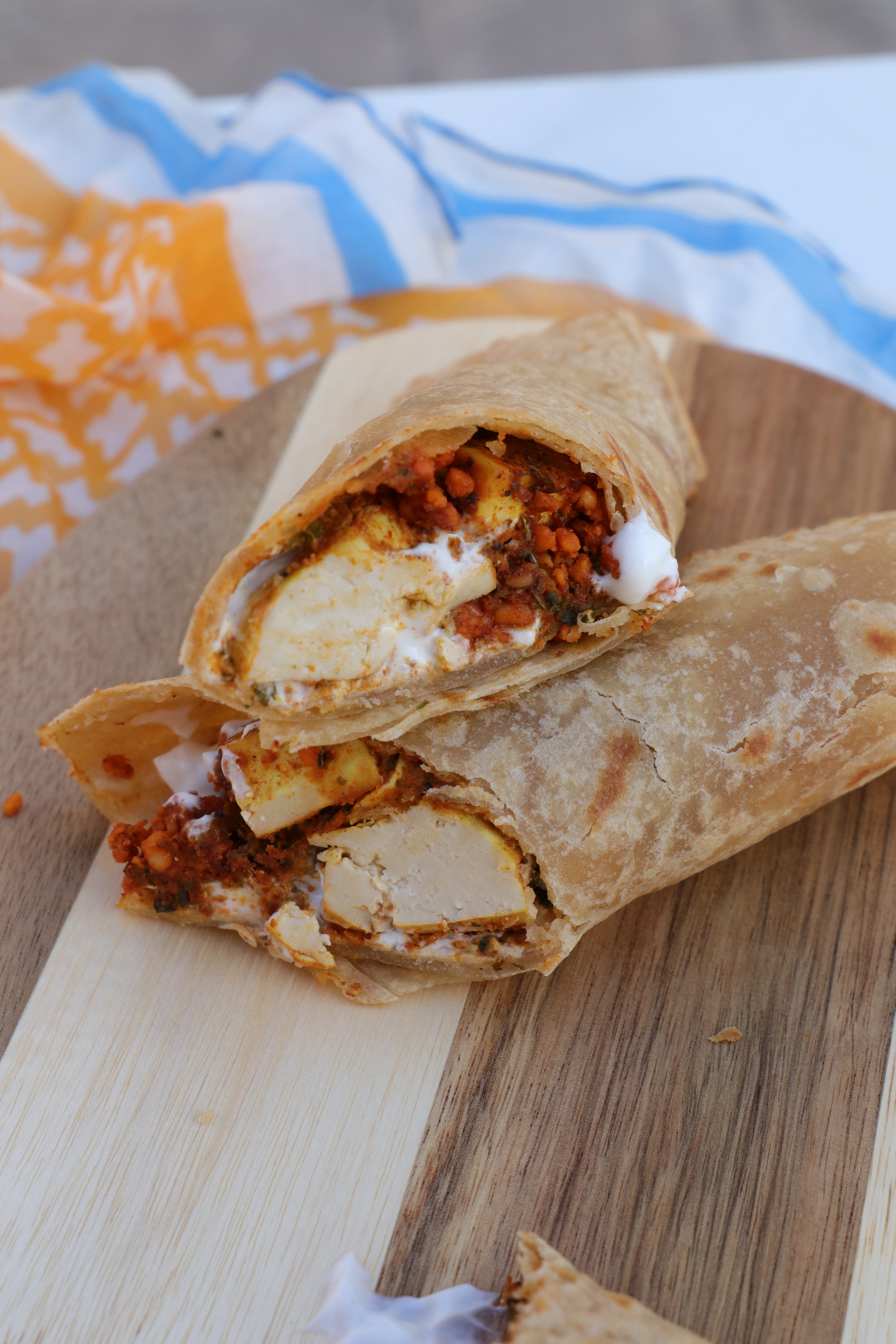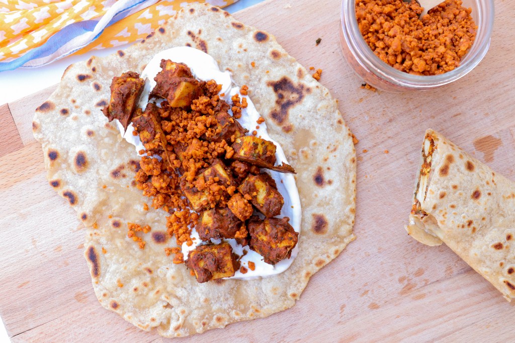 If you’re looking to make this recipe for non-Paryushan days, the rolls would pair amazing with some sautéed peppers, cilantro, chopped tomatoes, and cucumber! I would also add a few tablespoons of tomato paste to the marinade to give it a deeper umami flavor. That being said, this recipe as written is also incredible! Paired with some vegan yogurt, it is a perfect balance of spicy heat and cool creaminess! The optional peanut chutney adds a nice crunchy texture to the mix too. It makes a perfect lunch on the go (and an especially great lazy recipe to make after a long weekend), or fun dinner reminiscent of those late nights out in NYC!